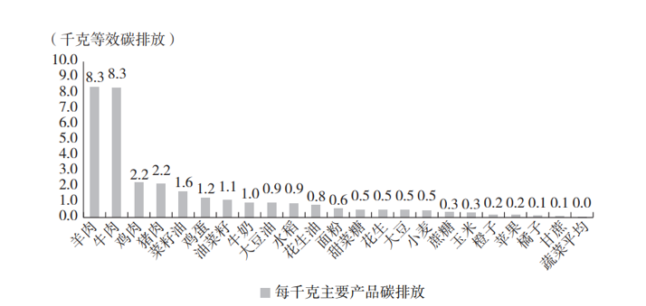 素食产生的碳排放量在同等情况下远远小于肉食。主要原因是动物在成长过程中对食物的利用率较低,以及会排放甲烷类气体。即使在肉类食品中,不同类型的肉所产生的碳排放量也不同,比如牛肉和羊肉等红肉所产生的碳排放量是相同质量的鸡肉、猪肉类食品的约4倍。根据不同的饮食习惯,美国等西方国家中,一份均衡的饮食结构中肉类占饮食碳排放量的56.6%,是饮食碳排放中最主要的组成部分。而中国人摄入水稻类主食较多,肉类占饮食碳排放量的36.5%。