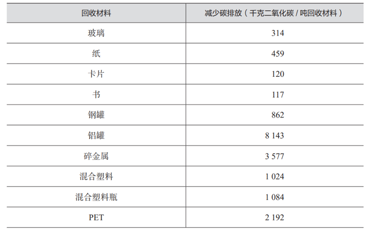 生产企业的积极参与是促进回收利用的要素废弃物回收再利用是减少碳排放最直接的手段之一。回收过程产生的碳排放量,通常远小于重新制造和垃圾填埋所产生的碳排放量。研究表明,根据材料的不同,每回收1吨垃圾可以减少最多达8.1吨的碳排放量。同时,根据材料的不同,即使对于塑料这个单一品类,分类回收也能显著提升垃圾回收效率,增加垃圾回收所减少的单位碳排放量可达50%~100%。