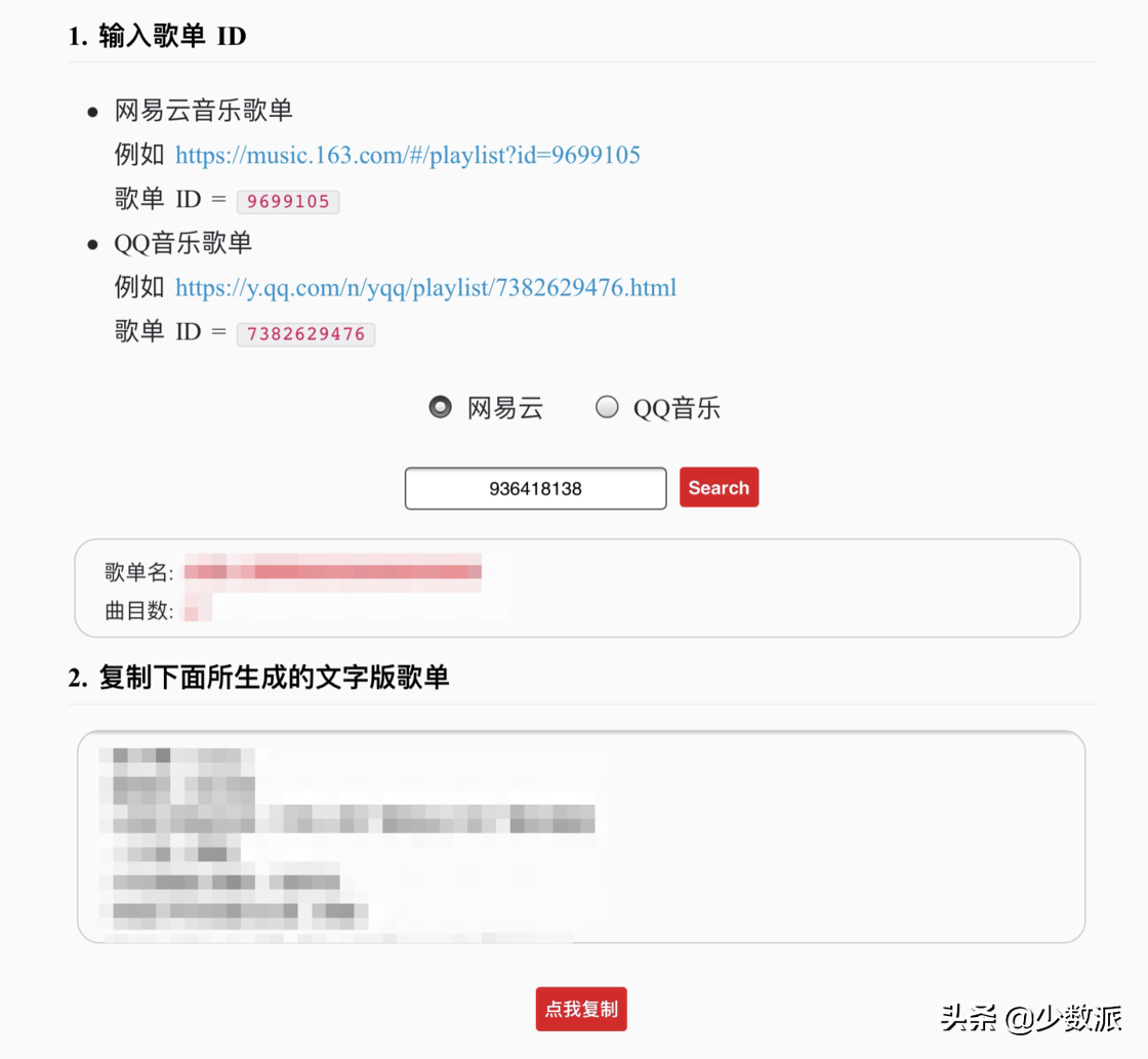 将这个 ID 粘贴到 这个网页 的输入框中,并点击「Search」即可将歌单转换为文字。随后,点击底部的「点我复制」即可回到 TuneMyMusic。