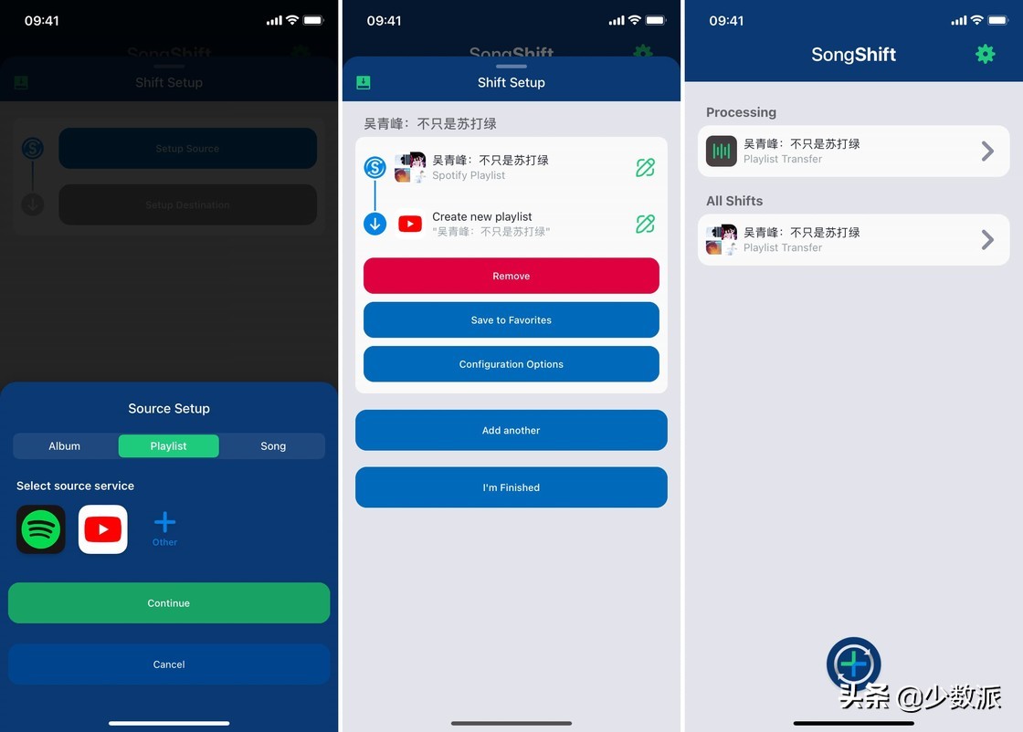 前文介绍的 TuneMyMusic 已经可以做到国际音乐平台之间的相互迁移,如果你是 iOS 用户,也可以尝试一下 SongShift 这款应用。在操作上,你只需要选择想要迁移的平台进行登录授权,随后选择歌单即可。