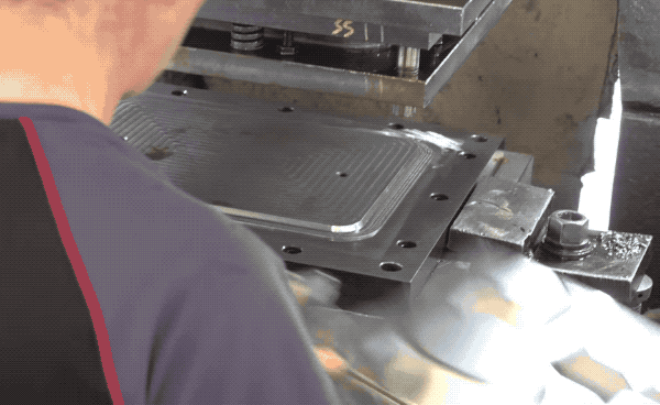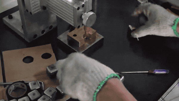 半个立方体首先,这一半的不锈钢冰块也是大力出奇迹出来的,就是在不锈钢板材上拉伸出半个立方体的空心壳体。过程和下面的不粘锅的制造中冲压差不多。