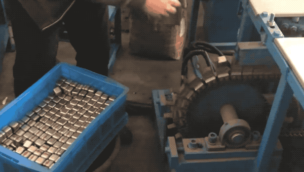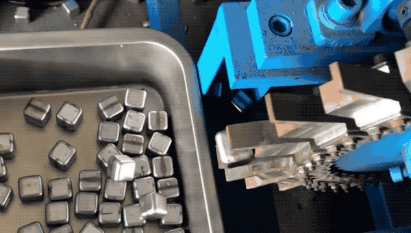 最后就是要排排坐,抛光光。把不锈钢冰块放在直直前进的卡槽上,送去自动抛光。