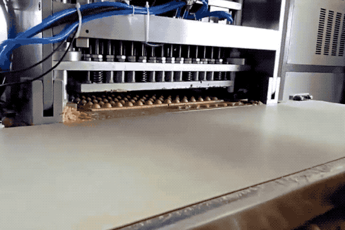 然后切割机一个落料,整板的饼干就被切出成一粒一粒的威化球,而被切去灵魂的威化板也只能黯然离场了...