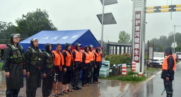7月20日,在焦作市博爱县磨头镇陈庄村丹河险工段,防汛人员集合并准备开始巡查险情。新华社记者 李嘉南 摄