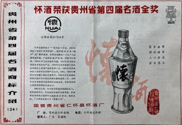 1986年,怀酒获得贵州省第四届名酒金奖,荣获贵州省人民政府第四届名酒证书;