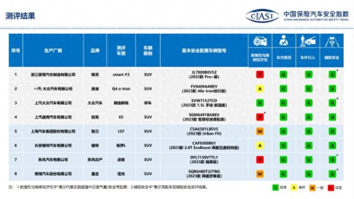 其实很多人不太了解碰撞测试具体都测试什么?那小编今天就拿智己LS7这次的碰撞测试成绩给大家简单科普下。这次中保研是同时公布了8款车型的成绩,基本上都是G的表现,只是在车辆维修经济性这一栏,每个车的表现不同。碰撞测试大的方面主要有四个: