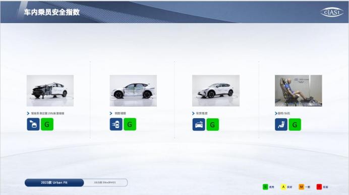 主要测试的是四个小项目:速度64km/h的25%偏置碰撞、50km/h的侧面碰撞、车顶强度以及低速座椅和安全带对人员的保护。