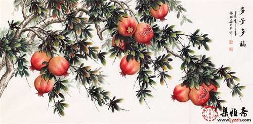 画面中,石榴树枝干从左侧延伸至右侧,错落分布的石榴悬挂于枝头,成为视觉焦点。枝叶疏密有致,既充实了画面,又避免了拥堵。背景为简洁的白色,起到了很好的衬托作用,让主体更加突出,整体布局简洁大方,给人以和谐之感。石榴在中国传统文化中是多子多福的象征。同时,也代表着生活的富足与美满,象征着财富和好运源源不断。整幅画传达出对家庭繁荣、幸福生活的美好祝愿。作为礼物送给老人生日,寓意家族兴旺、子孙满堂,表达对其未来生活幸福美满的诚挚祝福。