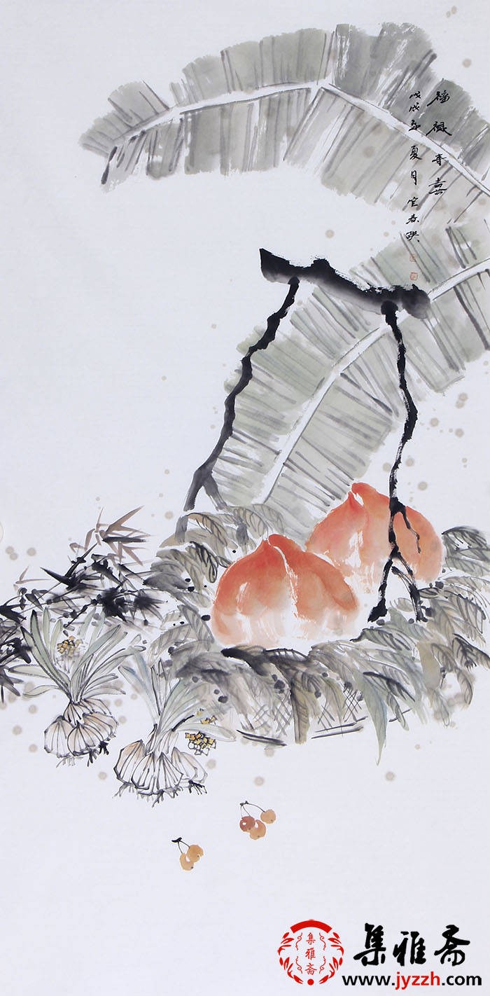 画面中,芭蕉叶占据上方空间,形成画面的框架感;寿桃位于中部偏下,成为视觉焦点;竹子和其他植物分布在周围,营造出自然的场景。右侧竖排的题字平衡画面构图,背景大量留白,简洁而富有意境。寿桃在传统文化中是长寿的象征,寓意健康长寿、福气满满。芭蕉叶有招财之意,竹子代表气节和坚韧。整幅画传达出健康长寿、生活富足、家庭和睦的美好祝愿。作为礼物在长辈生日送出、表达对其健康长寿的美好祝愿。