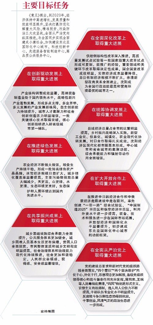 《意见》提出,到2020年,经济保持中高速增长,发展质量和效益明显提升,坚决打赢防范化解重大风险、精准脱贫、污染防治三大攻坚战,全面从严治党向纵深推进,与全国同步实现全面建成小康社会,加快建设东北亚国际化中心城市、科技创新中心、先进装备智能制造中心、高品质公共服务中心。