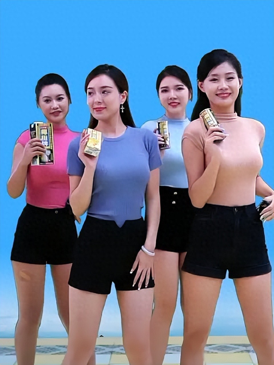 低领、短裙、舞蹈、整活,再来对比椰树集团,那快要戳到下巴的领口,那包得严丝合缝的上衣,除了裤子短一点,体态丰满点,根部没有到要掐直播的地步。