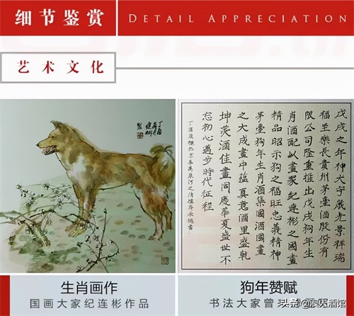 在细节设计方面,戊戌狗年茅台酒瓶盖采用金色纹路形状,顶部有篆体“狗”字样,整体金光闪闪、熠熠生辉。彩盒及瓶身局部元素采用中国国家画院副院长、专职画家、一级美术师纪连彬先生创作的狗年生肖国画;国家一级美术师,中国国家画院副院长曾来德先生创作的狗年生肖书法作品,作为产品包装元素之一,是茅台文化与传统文化的巧妙融合。