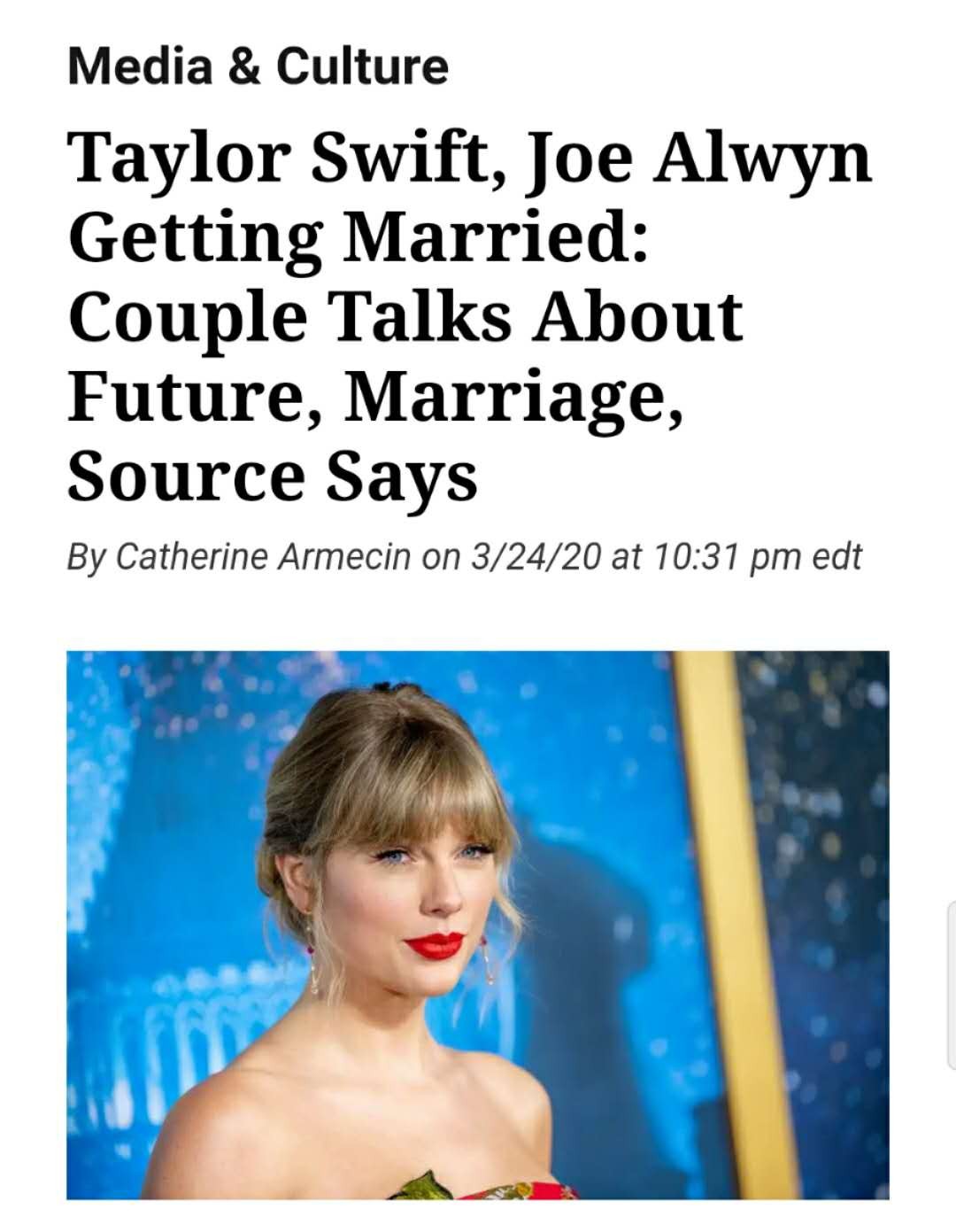 虽然经常有媒体拍到霉霉和乔·阿尔文一起出行的照片,但她就是不官宣,大众虽然觉得两人是在谈恋爱,但正主不承认,也没有办法。乔·阿尔文是英国演员,现年28岁,出演过李安导演的《比利·林恩的中场战事》。