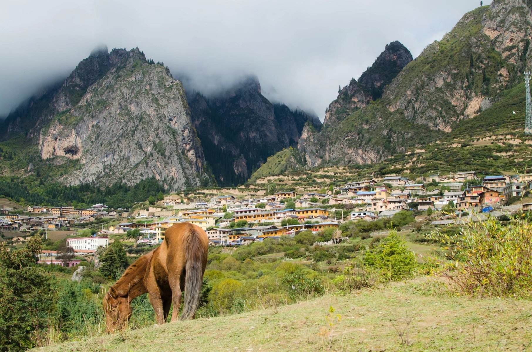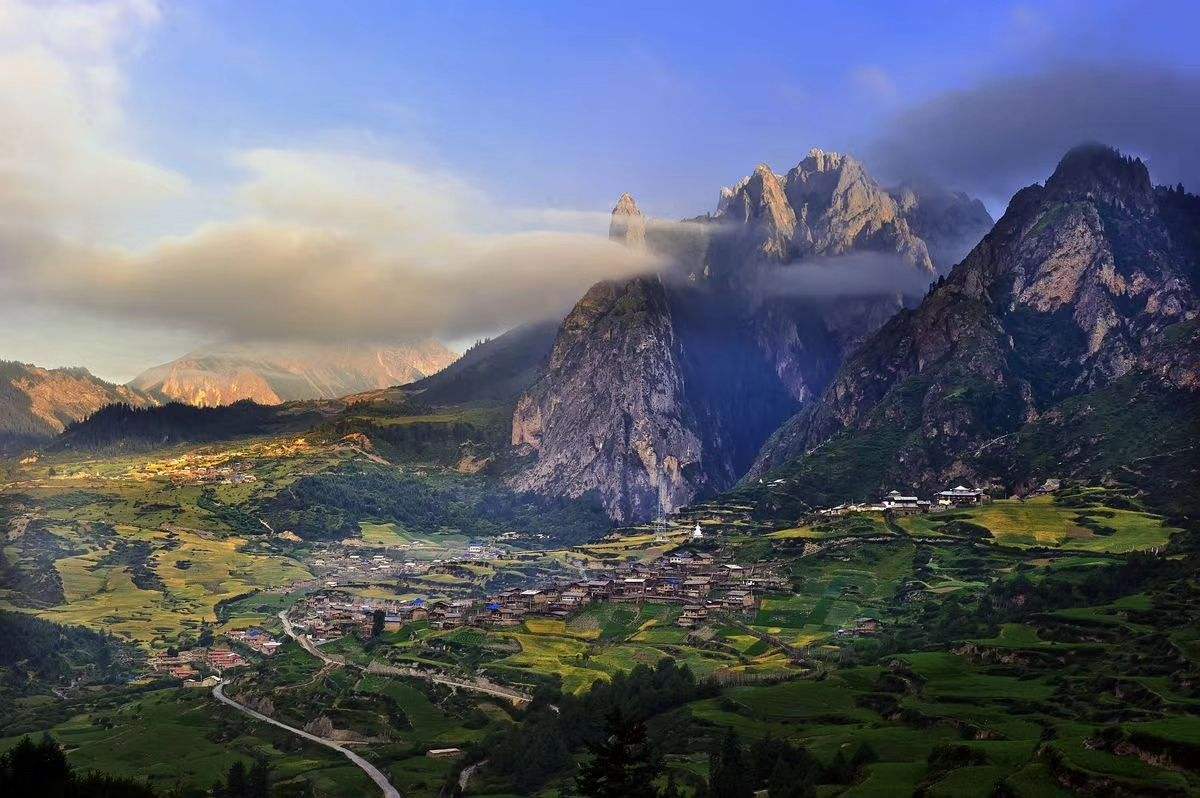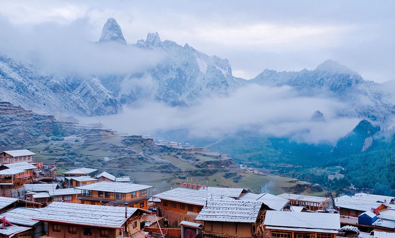 远远望去遍布宛若火柴盒的榻板房舍和田园风光,藏寨内游牧、农耕、狩猎和樵采等多种活动合理搭配和互补融合。