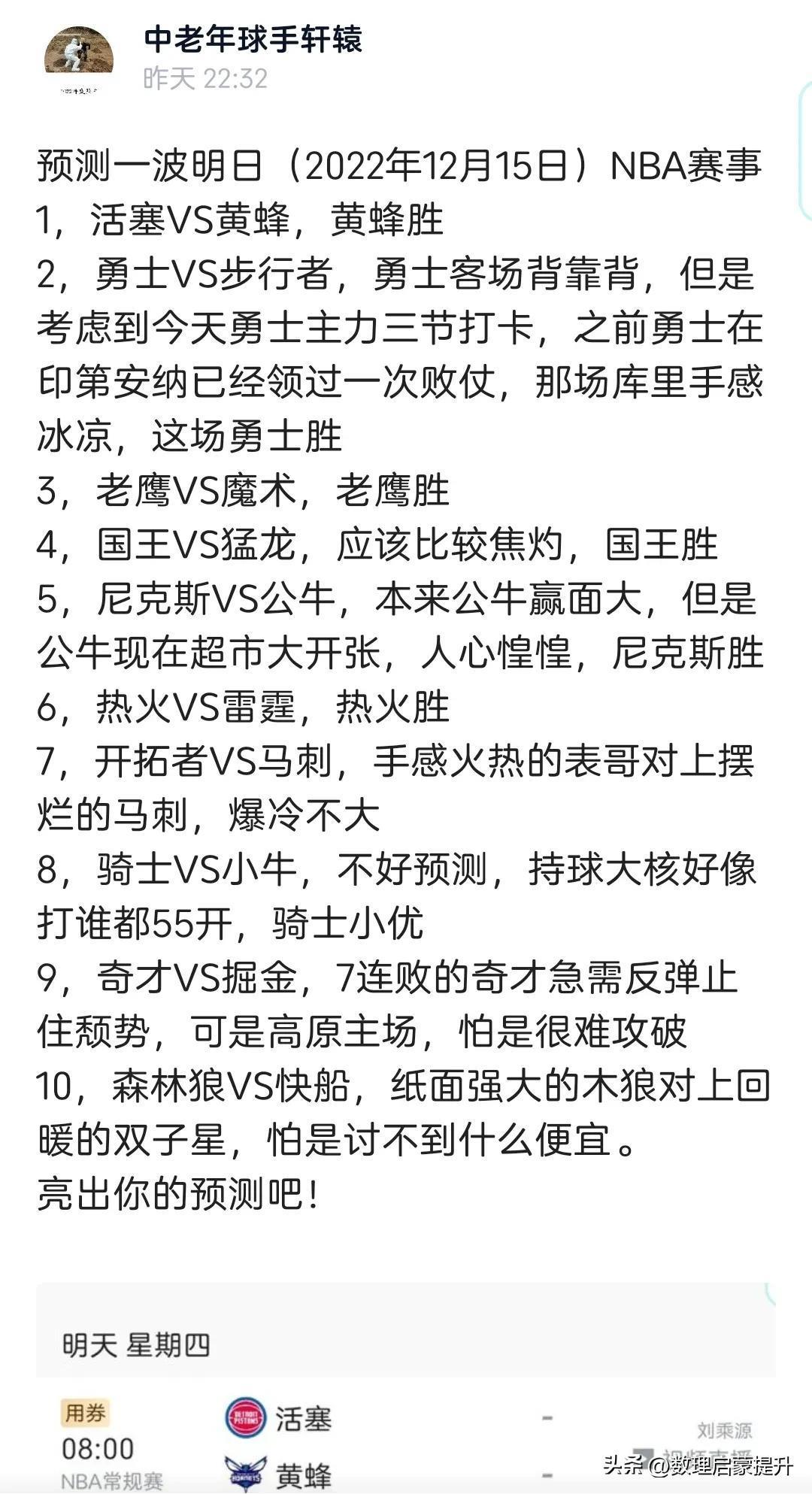 预测一波明日(2022年12月15日)NBA赛事