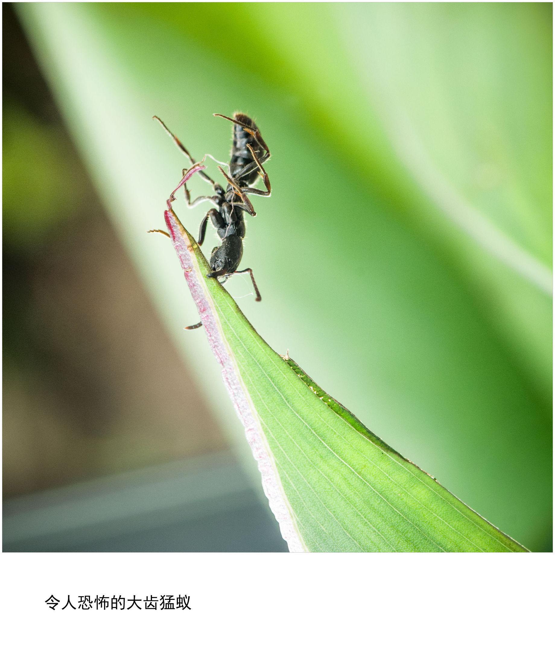 大齿猛蚁(Odontomachus bauri):又名诱捕颚蚁,它是自然界中上下颌闭合速度最快的掠食性动物之一(百度百科)。这家伙的双齿犹如老虎钳般特别地厉害,如果被它咬了就麻烦了。恰巧路遇这只大齿猛蚁,在拍摄过程中,它如同被打了兴奋剂一般,上蹿下跳、左滚右翻,其状态如同体操运动员在玩单杠似的。拍完之后才发现其姿态真有点恐怖,胆小的人看着会不舒服的。