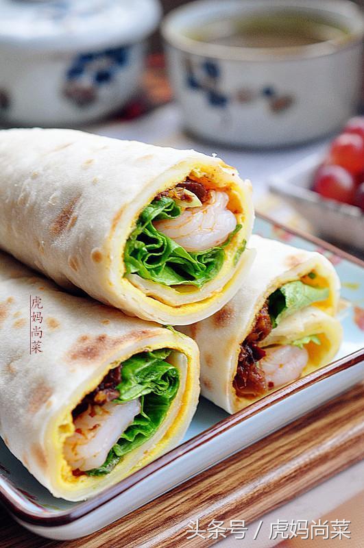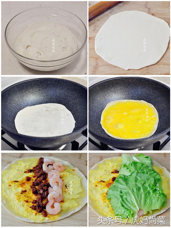 做法:面粉中加入酵母和温水,和成面团,然后用湿布盖上放过夜。转天早起,面团自然发酵体积变大,也醒透了。将面团取出,整理成宽条,分成小段。取一个,擀成圆形薄片。放入不粘锅中,最小火,烙至面片稍变色。然后将饼翻个面,上面倒上打散的一个鸡蛋液,用筷子划着铺满饼底。这是没用平底锅而用圆底锅的好处,面饼的边缘高起,蛋液再怎么弄都不会流出去的。等蛋液稍凝固就翻个面,让鸡蛋贴着锅底几秒钟,至鸡蛋全熟即可再翻过来,再用铲子稍压一压,让面饼全部熟透即可。蛋饼取出放到面板上,放两大勺牛蒡酱摊匀,再摆上虾仁。最后盖上生菜,卷起成卷即可,趁热吃。