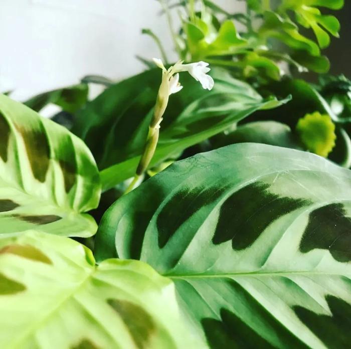 豹纹竹芋养护得当,每年大概会开花一次,只要它的植株生长成熟,再加上有适当散射光,环境比较温润,它就能开出白色的小花,不是特别显眼。