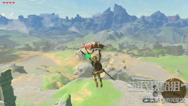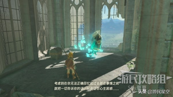 此时老人出现,我们需要爬到屋顶,只需要顺着墙壁爬上去就行,不要使用跳跃。来到顶部触发剧情。得知老人就是海拉鲁王国最后的国王,我们要击败魔王就需要先前往英帕。同时解锁滑翔帆。旁边的宝箱可以获得士兵之弓。