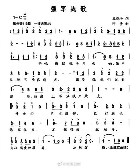 伟大的祖国,难忘的歌声【《强军战歌》:鼓舞全军将士的新军歌】“听吧,新征程号角吹响,强军目标召唤在前方。国要强,我们就要担当,战旗上写满铁血荣光。”词作家王晓岭以发音响亮,且辙韵宽敞的“江阳辙”在全词声韵的起承转合中归韵,“能够唱得响”的歌词,为歌曲在内容与形式上的成功打下了坚实的基础。作曲家印青采用了“抑扬格”,在弱拍的高音启动,并延续中国五声音阶上行后接入下行的方式,使歌曲主题依词而生,在音调与节奏上都具有中国军队情绪高昂的时代气息。