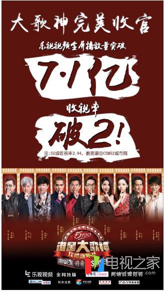 第一季《谁是大歌神》完美收官,十位歌坛唱将齐聚一堂,令收视率破2。得益于优质的内容和乐视的运营策略,《谁是大歌神》在乐视视频的播放量突破7.1亿,乐视综艺榜单前七中,《谁是大歌神》占5席。