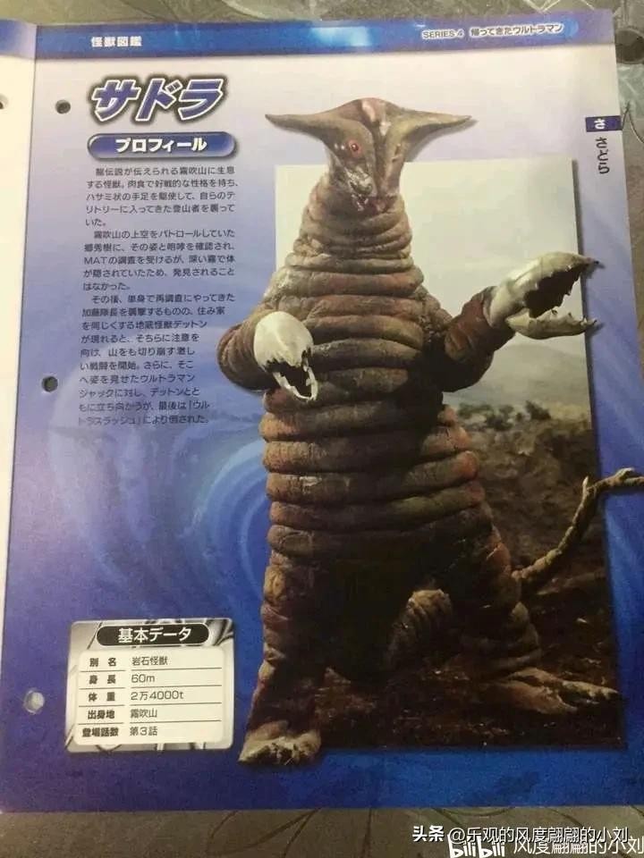 身体的数十节关节可以自由弯曲,通体茶色。在雾吹山有着浓雾的绝好藏身条件下生活着,并流传下了雾吹山的龙传说。与同样也在雾吹山一带的地底怪兽台顿的关系非常恶劣,每次见面必会打架。萨德拉的地盘在雾吹山地表上,台顿的地盘在地底。藏匿在浓雾里,袭击了前来的调查的MAT加藤队长,将其赶入洞窟后暂时消失,在台顿追赶企图逃跑的乡和加藤队长途中再度登场,随即和台顿缠斗,后来乡秀树变身杰克奥特曼出现,台顿和萨德拉暂停争斗,联手夹击杰克。萨德拉以双手的巨钳为武器,在战斗中对钳住杰克,和台顿合作一度压制杰克,杰克挣脱后,发射斯派修姆光线击杀企图逃跑的台顿,随后自己也被杰克奥特曼的八分光轮斩下首级。头部的角中有着类似鲨鱼的洛仑兹壶腹的生物电流感应器官,使萨德拉能在浓雾中发现对手。怪兽WIKI及部分资料的说法是萨德拉的眼睛有着类似探照灯的机能,可以发出亮光,所以能在雾里看到东西。
