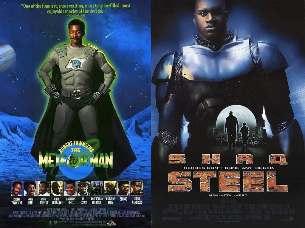 其实之前也有黑人英雄,比如1993年的《流星侠》,可惜电影太烂直接被人忽视。1997年也有一部以DC英雄“钢人”为主角的《钢铁悍将》,由大鲨鱼奥尼尔主演,更烂的没边,还比《再生侠》晚两周公映。