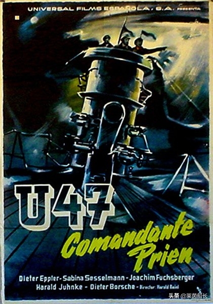 由德国导演Harald Reinl执导、1958年上映的德国影片《U47——普里恩上尉》(Kapitänleutnant Prien)是战后德国潜艇战题材影片的代表作。不过由于该片拍摄十分草率,剧情也实在太烂——U-47号潜艇被击沉后艇长普里恩被英国船救起,随后该船却被另一艘德国潜艇击沉,而这艘德国潜艇的艇长正是普里恩的原下属,惊呆的艇长结果又被盟军飞机结果了......这无疑白白浪费了这么好的一个题材。实际上,真实的U-47和艇长普里恩是纳粹德国海军神一般的存在!普里恩的最经典战例,是指挥U-47号潜艇于1939年10月13日孤军深入成功夜袭英国皇家海军斯卡帕湾海军基地,并击沉了排水量29150吨的“皇家橡树”号战列舰,后来U-47号所有艇员都飞往柏林并得到了希特勒的亲自接见。还与希特勒共进了午餐。U-47号的战斗历程完全因为普里恩这位艇长杰出的指挥、耐心的操纵和精确的决断而永载史册,甚至成为人类战争史上最经典的案例!这里值得一提的是,二战中德国海军潜艇部队的大部分战果都是一小部分以普里恩为代表的优秀王牌艇长获得的,其中共有32名的战绩超过了10万吨。从战果来看,德军王牌艇长们击沉的盟军舰船既包括排水量达42328吨的“不列颠皇后”号邮轮和排水量23722吨的“斯特朗萨兰”号运输船这样的大型商船,而且击沉敌主力战舰的成功战例比比皆是,如排水量31100吨的“巴勒姆”号战列舰、排水量22600吨的“皇家方舟”号、“鹰”航空母舰和排水量22500吨的“勇敢”号航空母舰等。考虑到这些主力水面舰艇往往都伴随有强大的护航和反潜力量,德军潜艇王牌们能取得这样巨大的战果着实难能可贵。